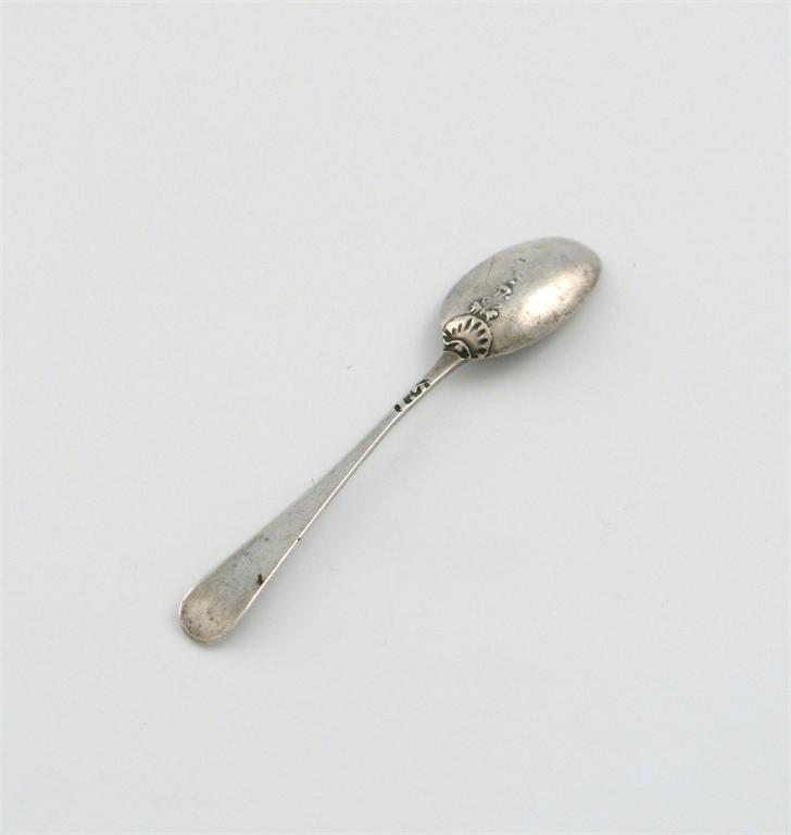 A mid-18th century silver Hanovarian snuff spoon, maker's mark only, probably that of James Tookey, the reverse of the bowl with a shell and foliate heel, length 7.2cm, approx. weight 3.2g.