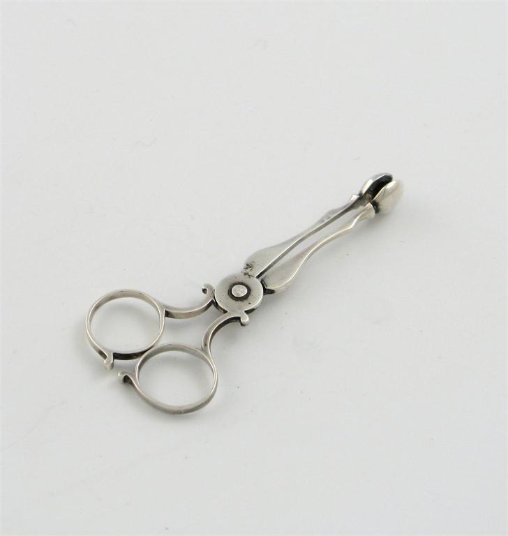 A pair of miniature silver sugar nips, with maker's mark to bowls, unidentified, plain ring handles and plain bowls, length 7cm.