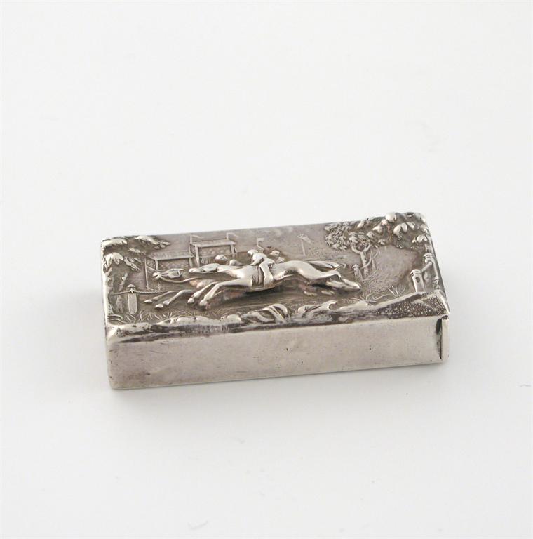 A late Victorian silver vesta case, maker's mark partially worn '?N', Birmingham 1894, embossed on the cover with a racing scene, initialled ASG on the reverse, hinged striker, length 5.4cm.