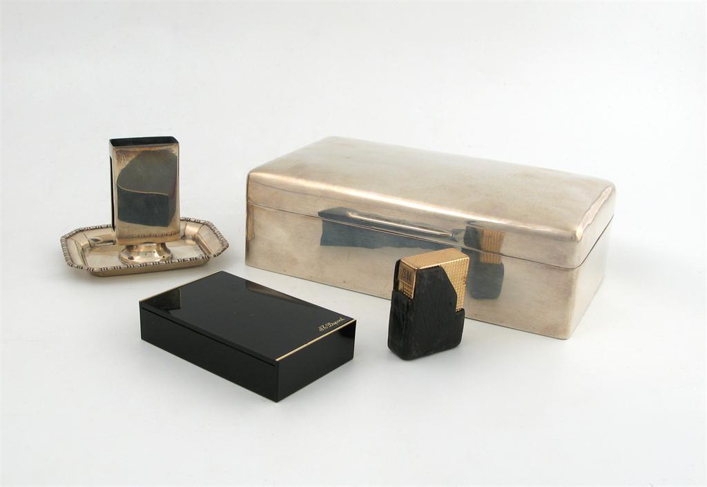 A silver cigarette box, by Richard Burbidge, London 1916, plain rectangular form, and a table match box holder, on a rectangular tray plus two Dupont lighters. (4)