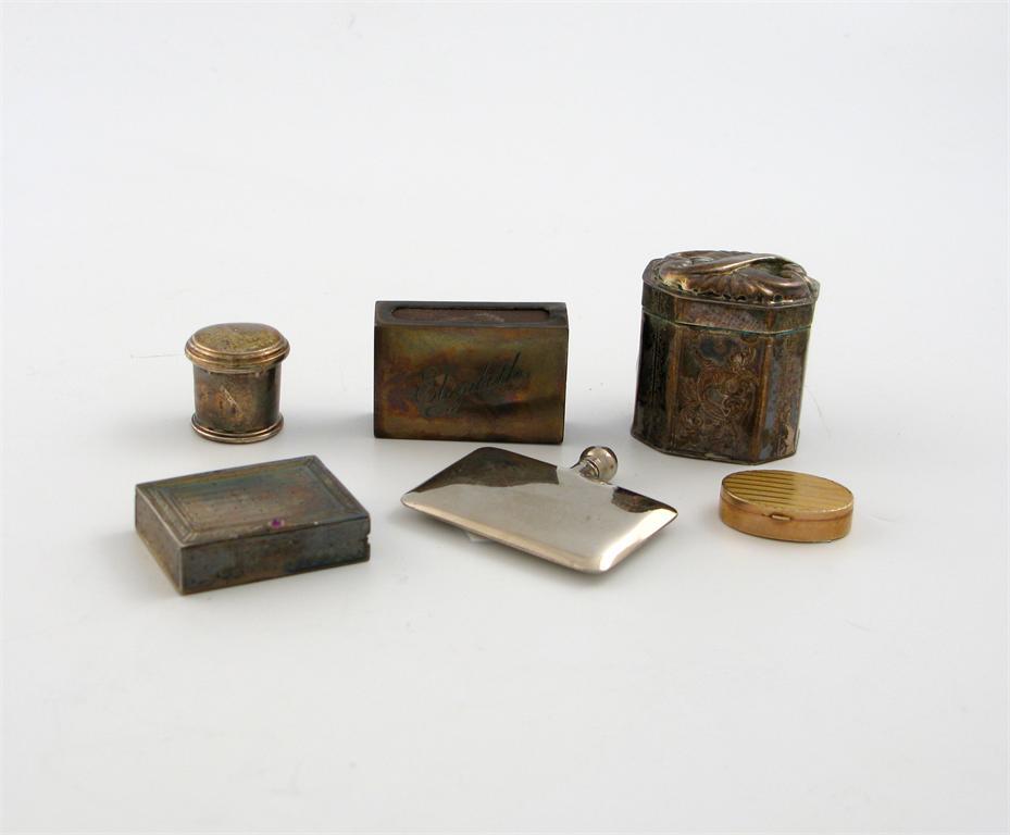 comprising a French vesta box, with engine turned decoration, an unmarked spice box, probably 18th century, a Dutch box, a match box cover, a 9 carat gold pill box, cover a.f, and a base metal scent flask, approx. weight of gold 8g. (6)