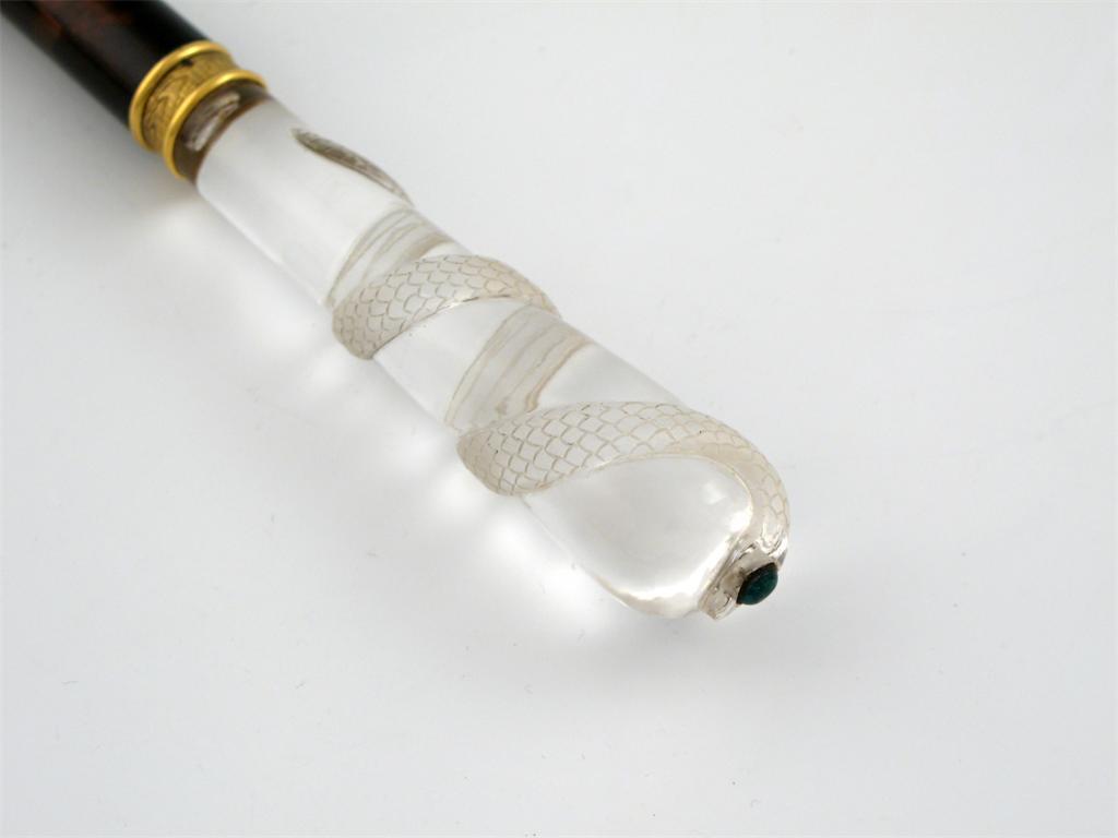tapering circular form, the rock crystal carved with a snake and with a green stone finial, length 30.5cm.