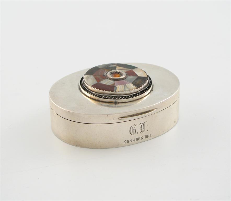 oval form, the hinged cover set with a circular vari-colour hardstone mount and set with a central hardstone, inscribed, length 9.3cm.