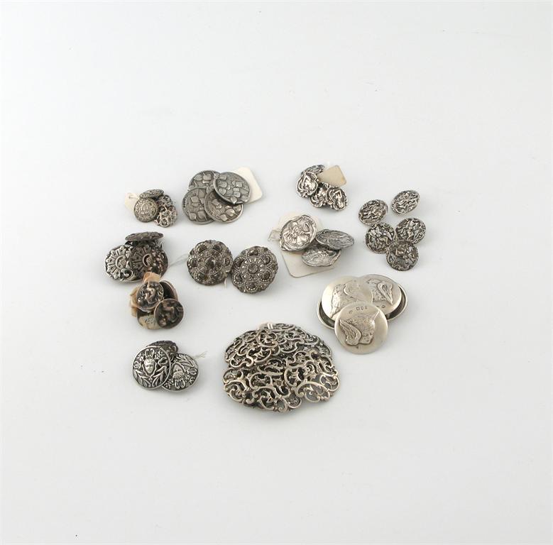A small collection of silver buttons, various dates and makers, comprising; a late-Victorian set of six with pierced scroll decoration, London 1899, a set of five with cherubs, London 1900, plus various others and two steel buttons. (qty)