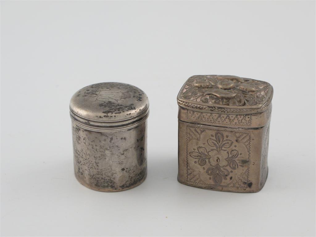 A George III silver cylindrical box, Maker's mark T W, possibly for William Troby, London 1811, plain, with a pull-off cover, monogrammed, together with a Dutch silver box. (2)