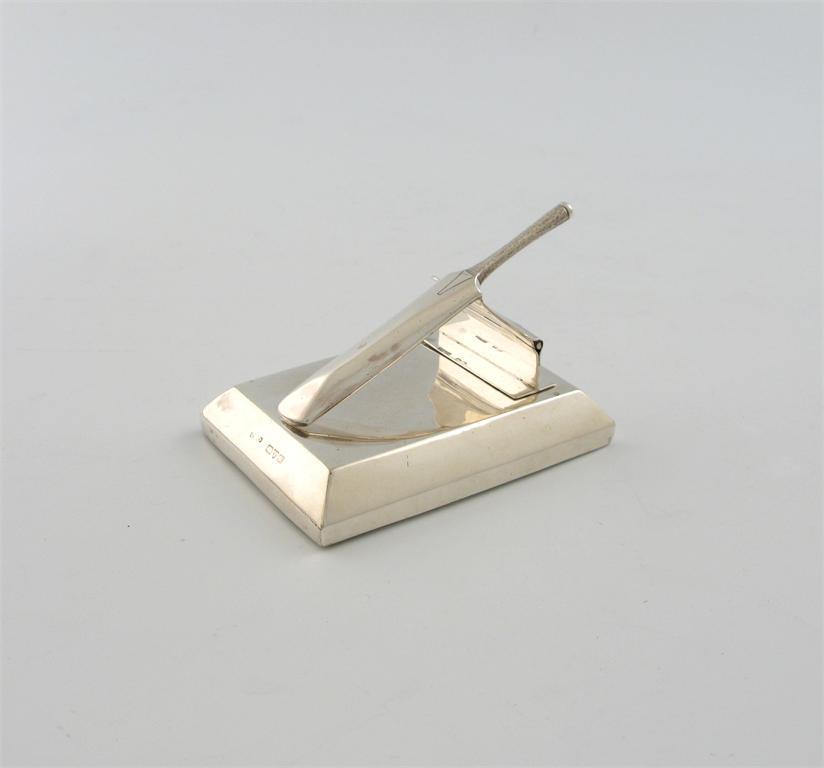 A novelty silver cricket bat paper clip, by Grey and Co, Chester 1913, the spring-hinged cricket bat on a raised rectangular weighted base, length 9.4cm.