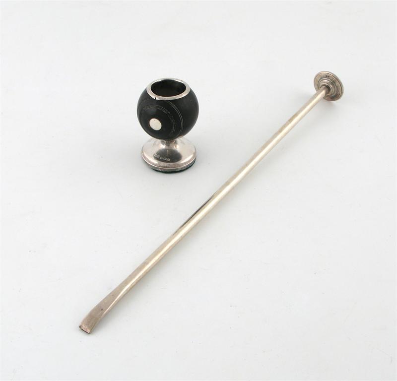 A silver mounted bowls trophy table vesta holder, by Walker and Hall, Birmingham 1931, formed as a miniature bowling ball, on a raised circular foot, inscribed, plus an Edwardian silver candle douter, Birmingham 1908, length 30.5cm. (2)
