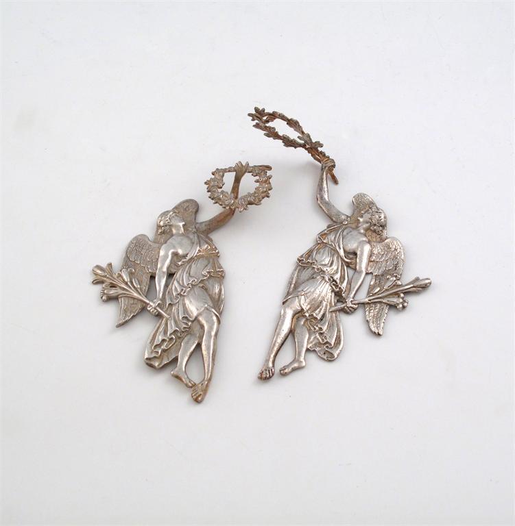 A pair of unmarked silver mounts modelled as angels, both standing and holding a laurel wreath, height 12cm and 12.2cm. (2)