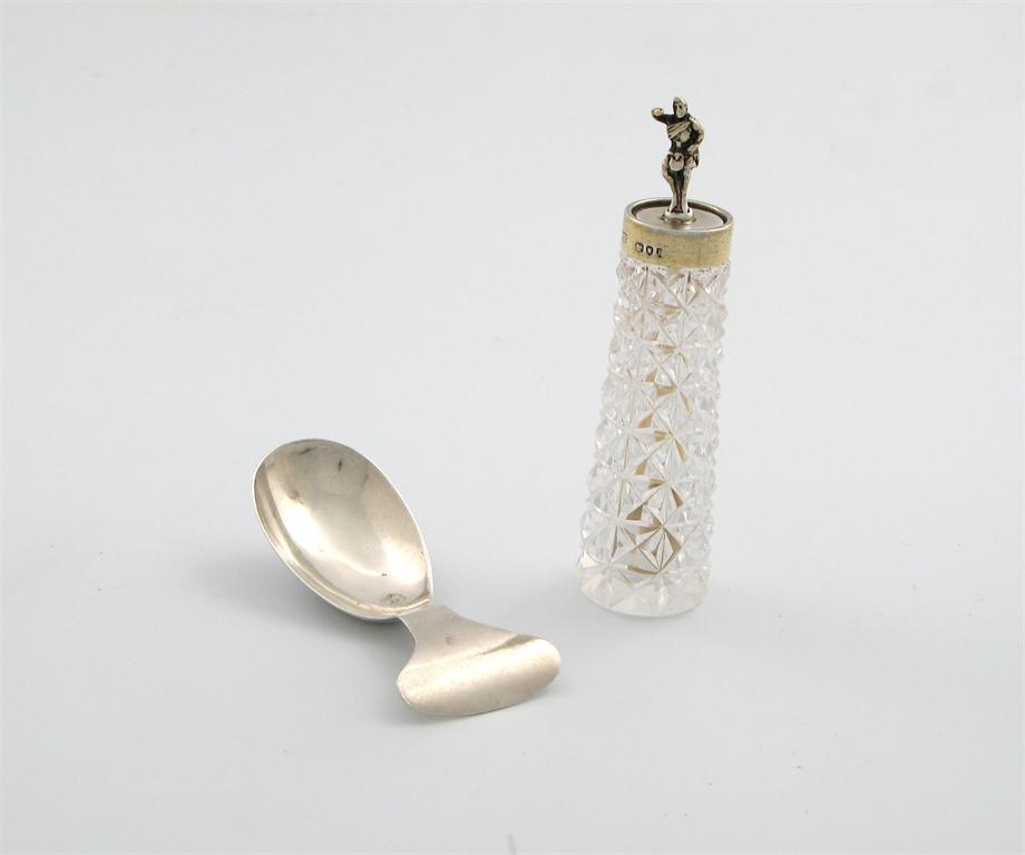 A Victorian silver mounted cayenne pepper pot, by E. Hutton, London 1892, tapering circular form, the spoon with a figural terminal, plus an Edwardian silver caddy spoon, by William Hutton and Sons, Sheffield 1908. (2)