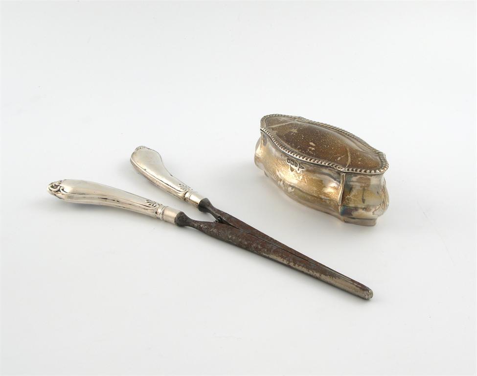 An Edwardian silver box, by Walker & Hall, Sheffield 1905, shaped navette form, bellied body, gilt interior, hinged cover with gadrooned border. length 11cm, approx. weight 2.5oz. together with a pair of silver mounted glove stretchers. (2)