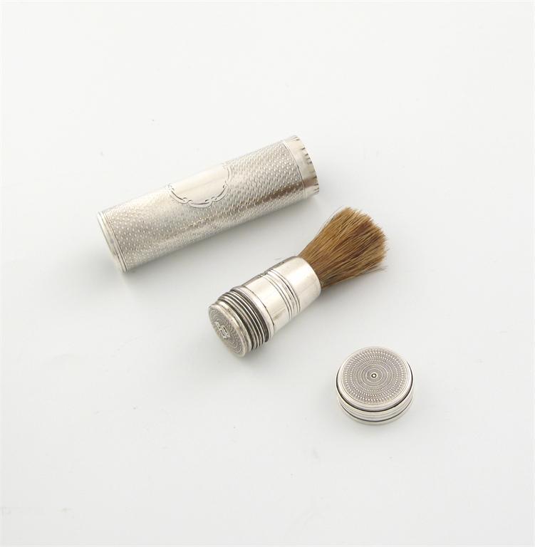 A Victorian silver travelling shaving brush, by Thomas Whitehouse, London 1860, engine turned cylindrical case, with a vacant cartouche, length 7.8cm