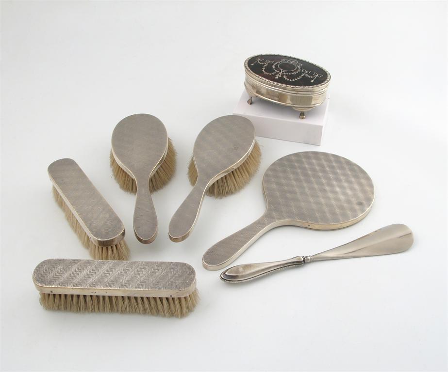 oval form, the hinged cover, inlaid with pique work, husk border, on four bracket feet, plus a five piece silver dressing table set, with good engine turned decoration, London 1966, and a German silver handled shoe horn. (7)