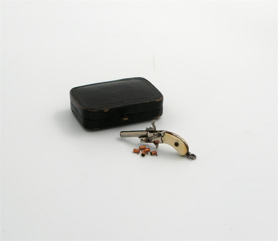 A 19th century miniature pinfire pistol, possibly Belgian, with an ivory stock, in a fitted red velvet lined case, length 4.4cm.