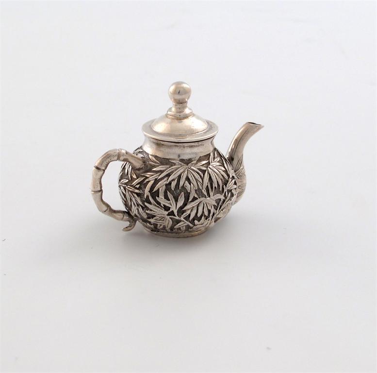 A Chinese miniature silver tea pot, marked with Chinese characters and maker's initial I.W, circular form, embossed bamboo decoration, simulated bamboo handle, height 4.5cm, approx. weight 1oz.