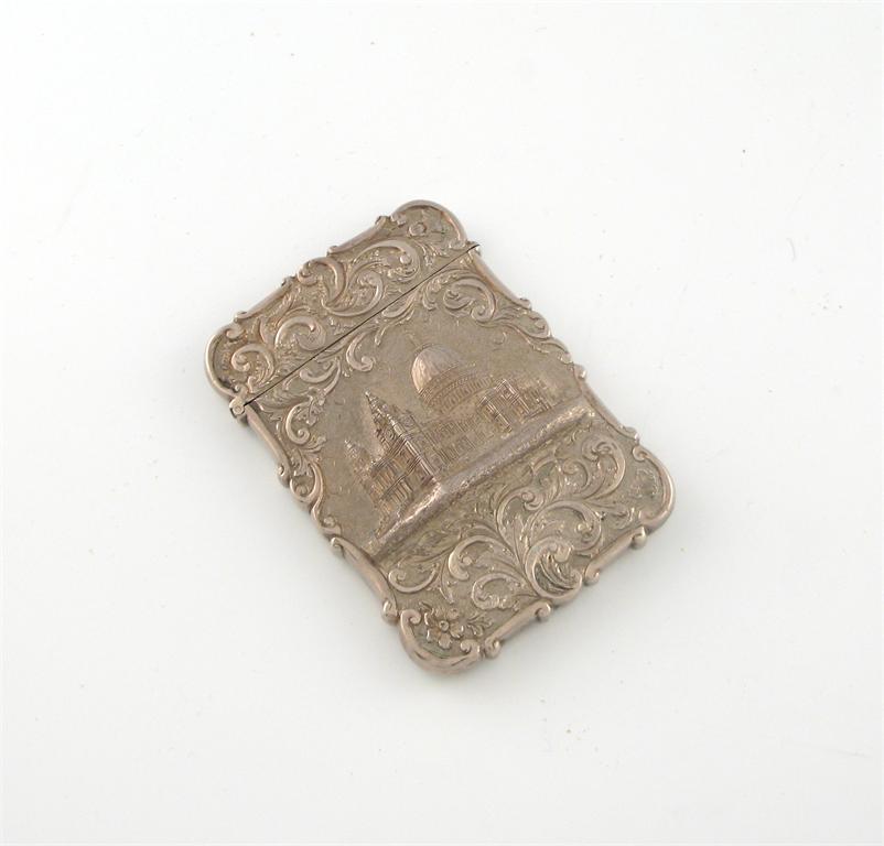 A Victorian embossed castle-top card case, by Nathaniel Mills, Birmingham 1845 with a view of St Paul's Cathedral, in high relief flanked by chased scrolls, the reverse also with chased scrolls, length 10cm, approx. weight 2.5oz.