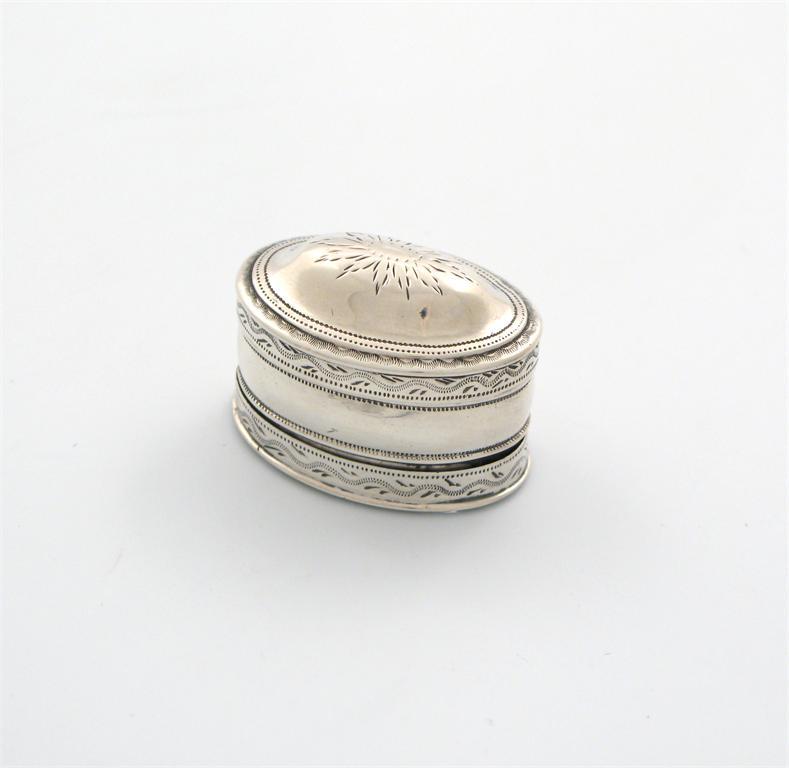A George III silver nutmeg grater, by Samuel Pemberton, Birmingham 1796, oval form, with bright-cut decoration, domed pull off cover, length 3.5cm, approx. total weight 0.5oz.