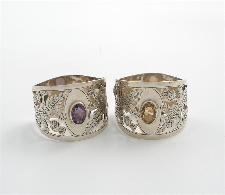 pierced and engraved with thistles and set with a purple and yellow coloured glass cartouche, approx. weight 2oz. (2)