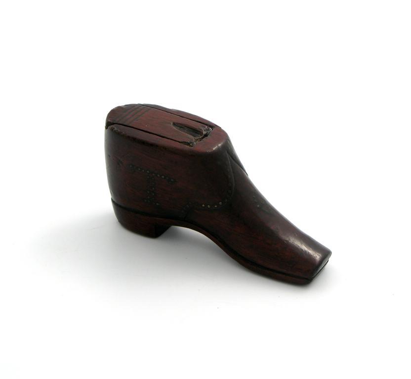 A 19th century novelty treen snuff box, modelled as a shoe, with inlaid pique work, initialled 'T.D', length 7.5cm.