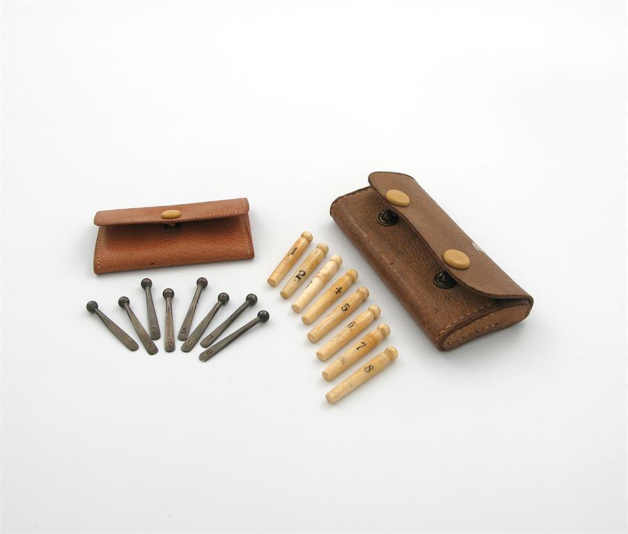 A set of eight butt markers, unmarked, retailed by Swaine and Adeney, London, numbered 1-8, in a fitted pigskin case, plus a set of eight ivory butt markers, in a pigskin case. (2)