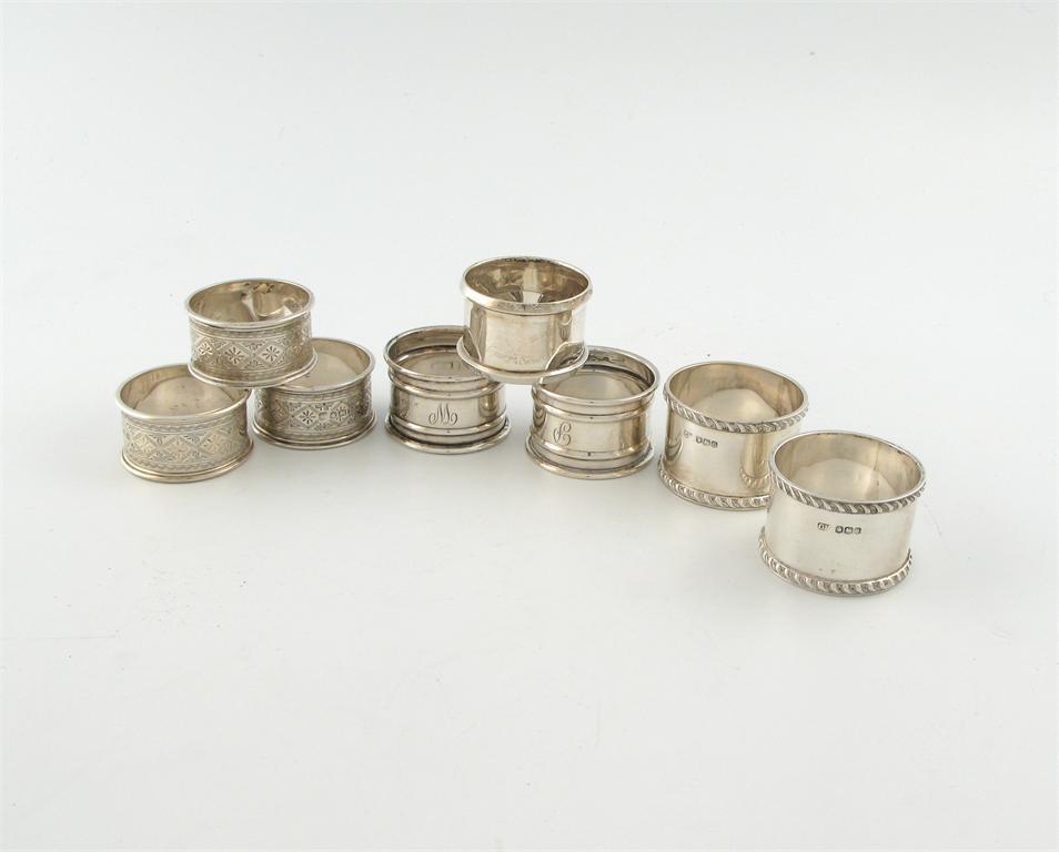 A quantity of silver napkin rings, mixed maker's and dates, including an Edwardian set of three engraved and numbered examples, approx. weight 6oz. (8)