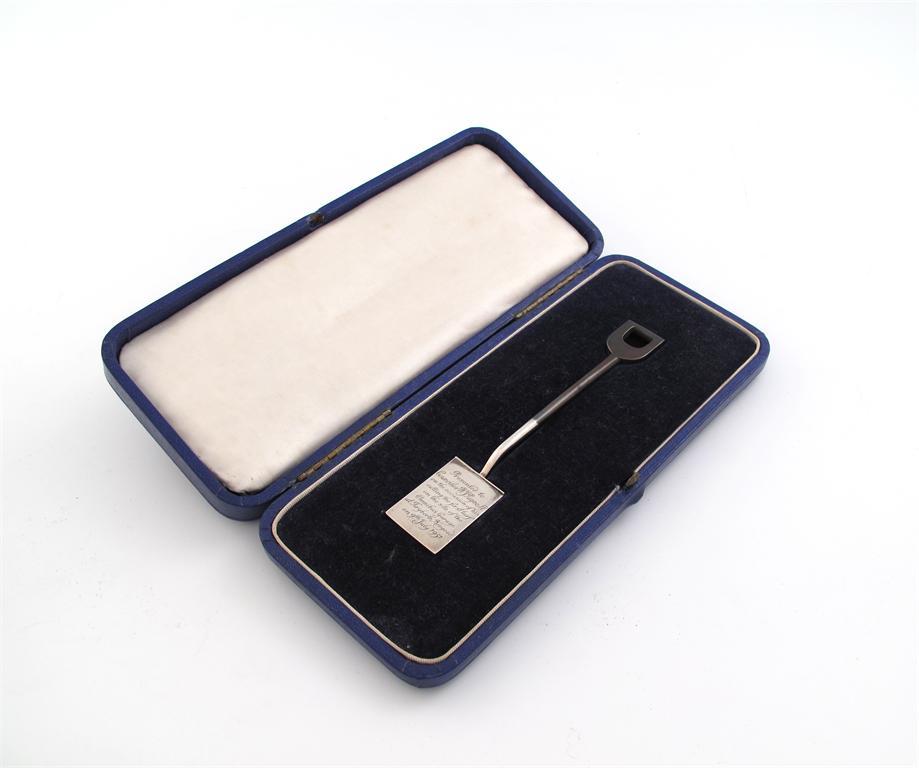 the silver blade inscribed, ' Presented to Councillor W.J. Payne J.P on the occasion of his cutting the first turf on the site of the Omnibus garage at Fryberth, Hengoed, on the 9th July 1951', burnished copper handle, in a fitted case, length 14.8cm