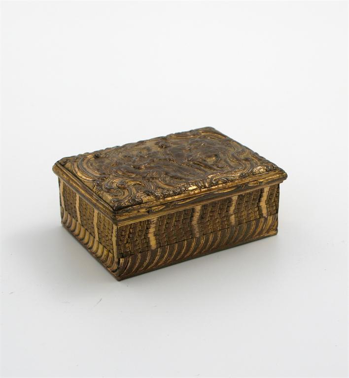 An 18th century gilt metal snuff box, probably English, circa 1760, rectangular form, the hinged cover embossed with a classical scene, the sides and base with chased decoration, length 7.9cm