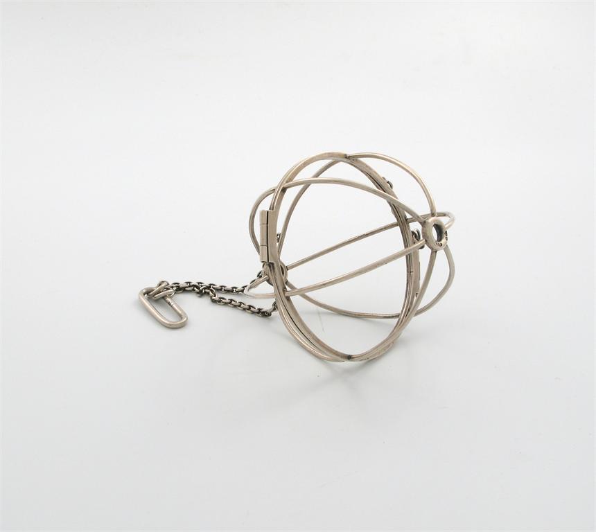 A George III silver wirework wool holder, possibly by John Prosser, London circa 1800, globe form, with a hinged cover and hanging chain, diameter 9.5cm, approx. weight 3oz.