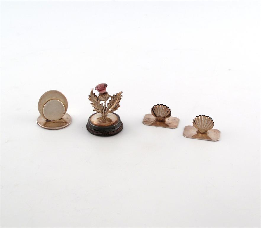 comprising: An Edwardian one modelled as a thistle, with a purple flower, on a circular base, Birmingham 1907, plus a pair of shell form, with import marks for London 1985, and a plain circular menu card holder. (4)