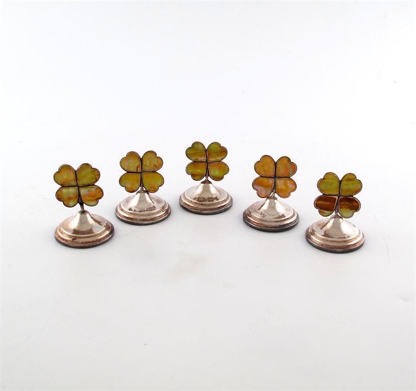 formed as four leaf clovers, on raised circular bases, height 4.5cm. (5)