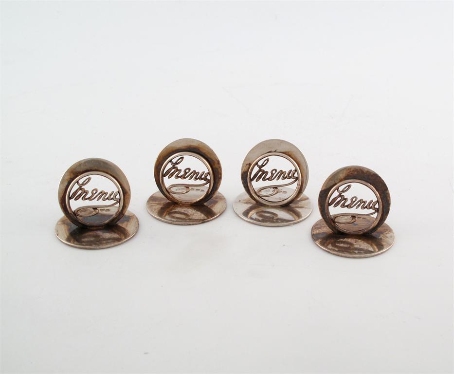 circular form, pierced 'MENU', on circular bases, height 3cm, approx. weight 4oz. (4)