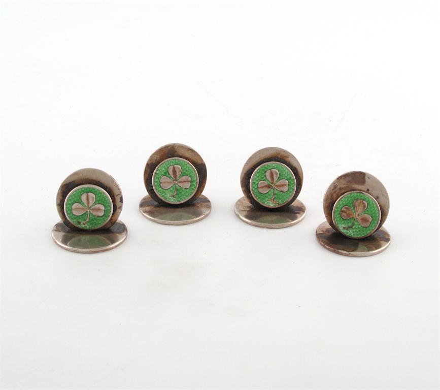 circular form with shamrocks on a green enamelled background, the whole on circular bases, height 2.8cm, approx. weight 3.9oz. (4)