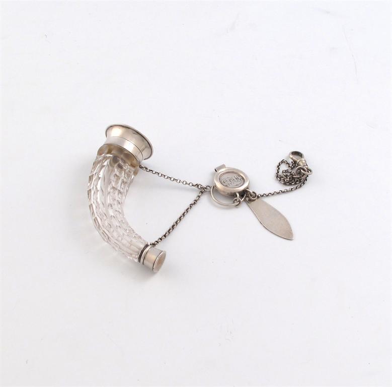 A 19th century French silver mounted scent bottle, maker's mark AG in a lozenge, in the form of a horn, hinged cover opens to reveal a stopper, suspension chain, with an associated belt clip.