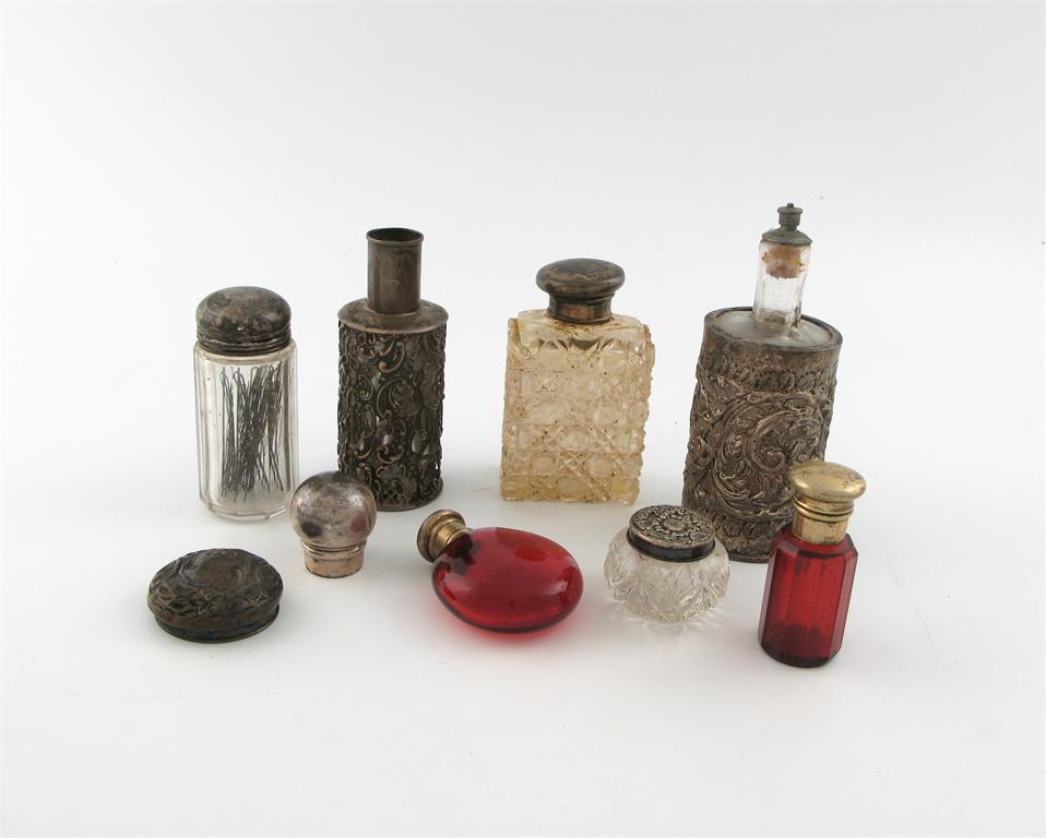 together with two silver bottle lids, a faceted glass bottle with electroplated mounts, and two ruby glass scent bottles with electroplated mounts,