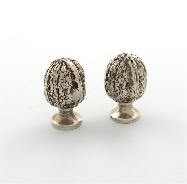 A pair of modern novelty silver salt and pepper pots modelled as walnuts,