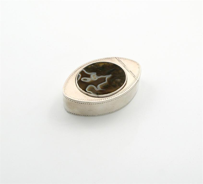 A George III silver mounted agate snuff box, by Phipps and Robinson, London 1784, oval navette form, bright-cut borders, the centre inlaid with a circular cartouche, length 10cm, approx. weight 3.5cm.