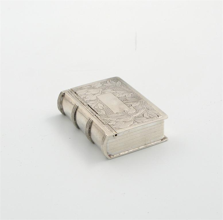 A 19th century Chinese export silver snuff box, marked with Chinese characters, modelled as a book, with chased foliate decoration, length 5.5cm.