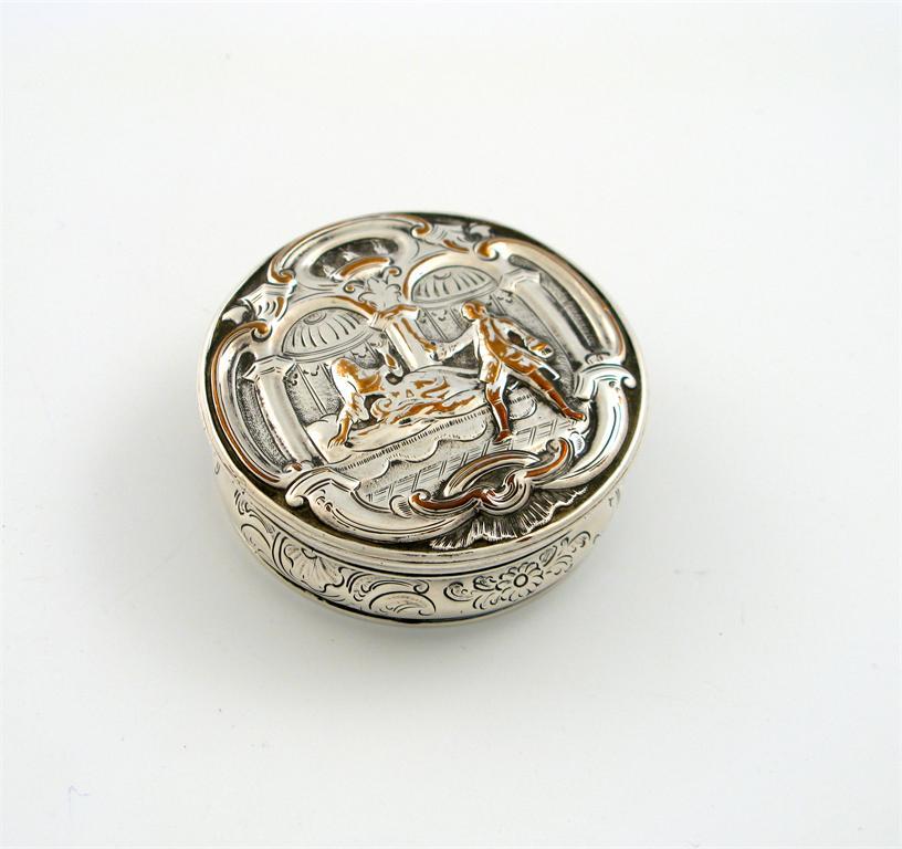 A mid 18th century old Sheffield plated snuff box, circa 1750-60, circular form, chased decoration, the pull off cover embossed with a classical scene, diameter 6.4cm.