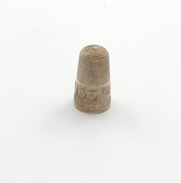 Brighton Pavilion interest, a silver thimble, unmarked, the sides chased with a scene of Brighton Pavilion, height 2.5cm, approx. weight 0.1oz.