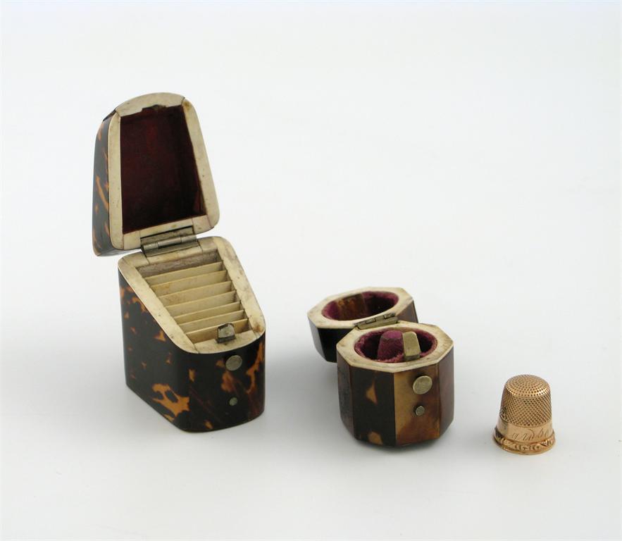 A late Victorian tortoiseshell needle box, modelled as a knife box, with a plain cartouche, plus a tortoiseshell thimble case of octagonal form, the interior with a small unmarked gold thimble, approx. weight 3g. (3)