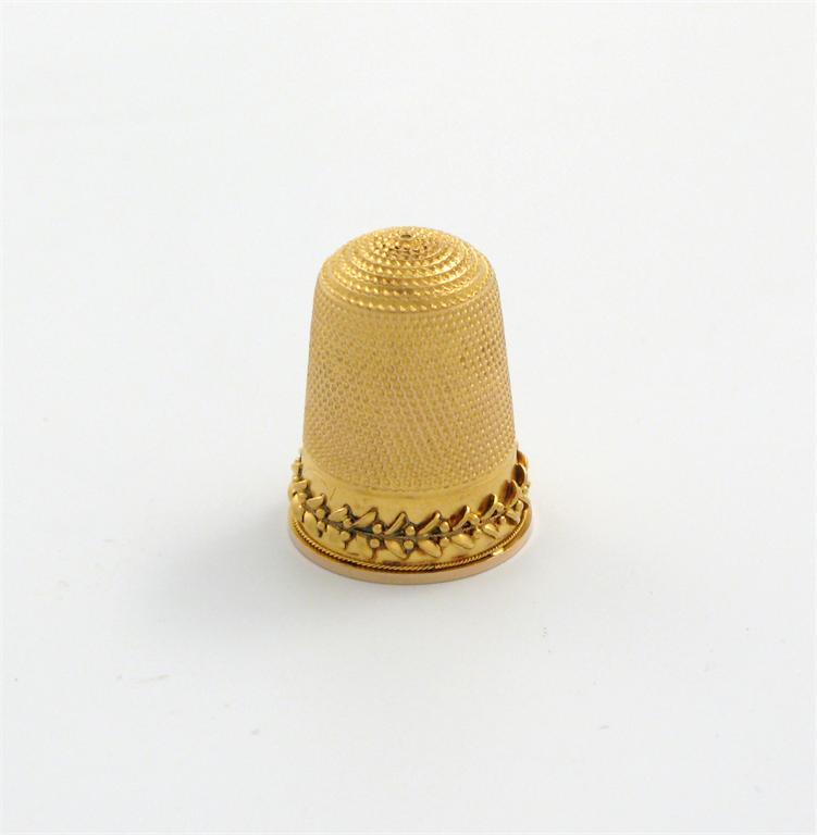 A late 19th century gold thimble, unmarked, conventional form, with a lower band of foliate decoration, height 2.3cm.