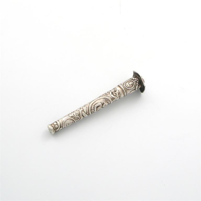 tapering circular form, embossed with foliate decoration and figures, and above one figure the word Zoutman, possibly for Rear Admiral Zoutman of the Dutch navy, the terminal initialled, length 9.6cm, approx. weight 0.7oz.