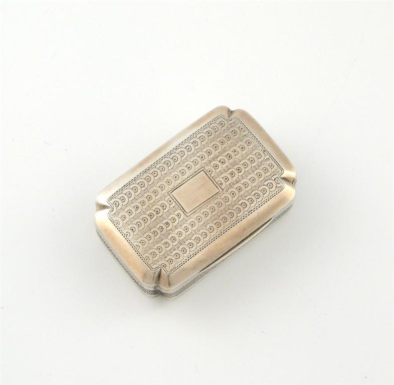 A George III snuff box, by Samuel Pemberton, Birmingham, 1787, with engine turned decoration, rectangular with canted corners, vacant title area, gilt interior, length 4.8cm, approx weight 0.5oz.