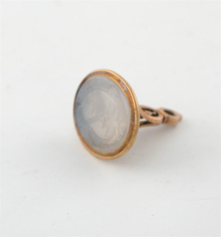 A George III gold mounted chalcedony fob seal, with intaglio coat of arms, height 3cm.