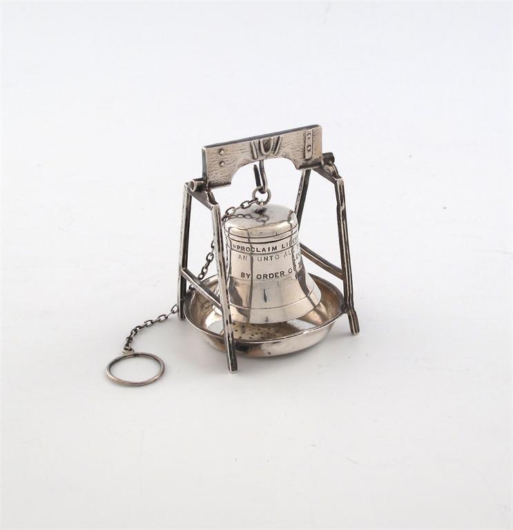 modelled as the Liberty bell, with a chain, and inscribed 'PROCLAIM LIBERTY THROUGHOUT ALL THE LAND AND UNTO ALL THE INHABITANTS THEREOF, LEVITCIUS, XXV, 10, BY ORDER OF THE ASSEMBLY OF PENNS'Y, IN PHILA. 1752' , the stand modelled as a wooden bell cradle, with a circular base, height 7.3cm, approx. weight 1.5oz.