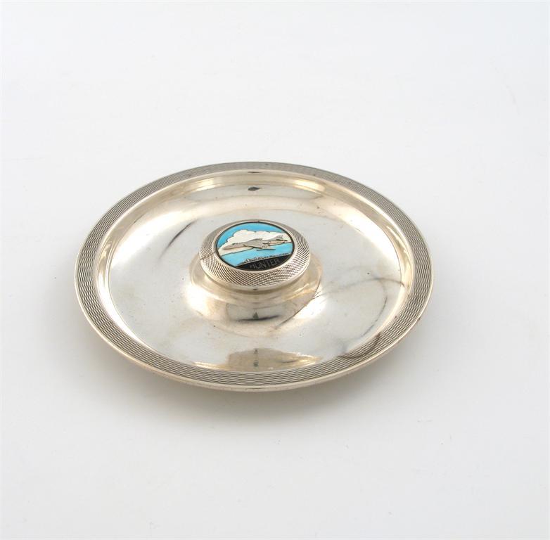 A silver and enamel ashtray, by Turner and Simpson Ltd, Birmingham 1956, circular form, engine turned decoration, the centre enamelled with the Hunter fighter jet, diameter 13.5cm.