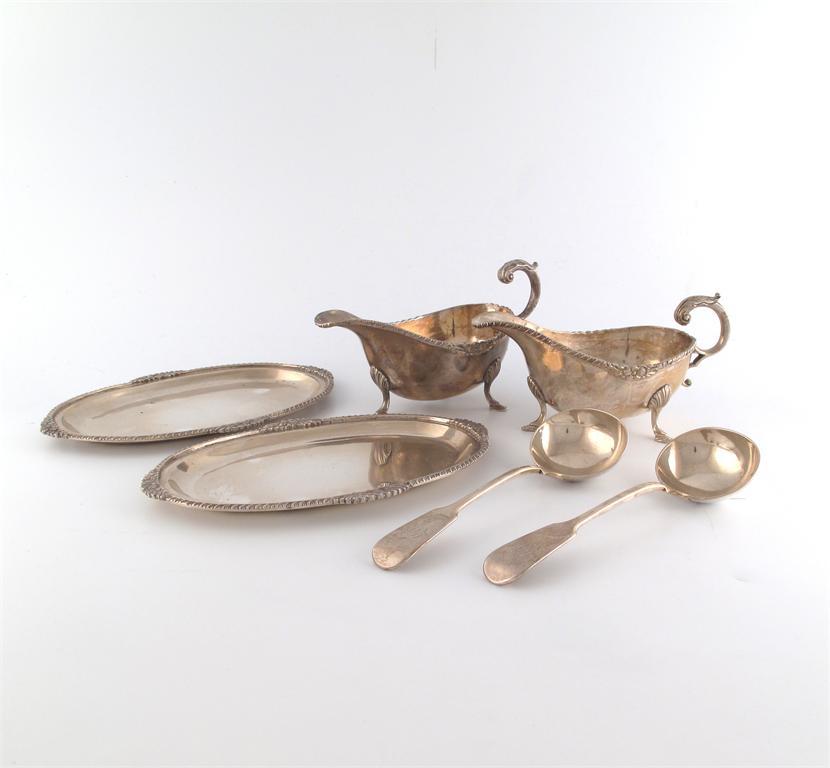 oval form, foliate gadroon border, leaf capped scroll handle, on three shell capped hoof feet, pn oval bases, plus a pair of Victorian silver Fiddle pattern sauce ladles, by Stephen Smith, London 1856, approx. weight 30oz. (6)