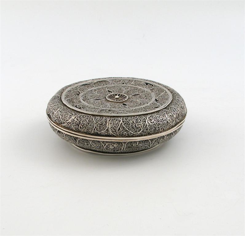 A silver filigree bowl and cover, unmarked, probably 19th century, circular form, pull off cover, diameter 12.7cm, approx. weight 9oz.