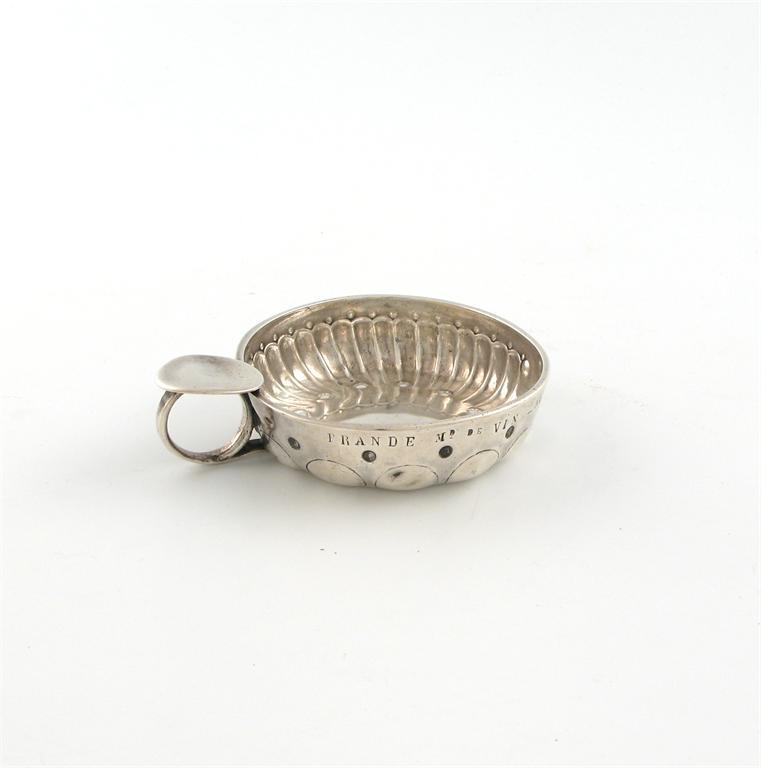 A 19th century French silver wine taster, circular form, part fluted decoration, ring handle with a plain thumb-piece, inscribed 'FRANDE MD DE VIN NEUVIS' diameter 7.8cm, approx. weight 4oz.