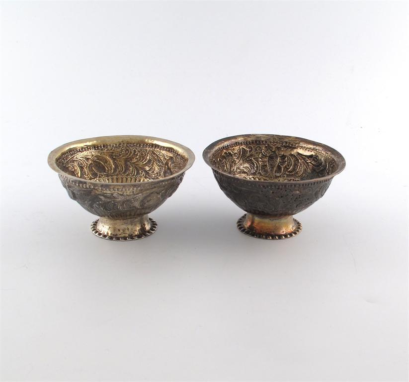 Two 19th century Dutch silver bowls, of tapering circular form, embossed foliate and part fluted decoration, on a raised beaded circular foot, diameter 11.8cm, approx. weight 10oz. (2)