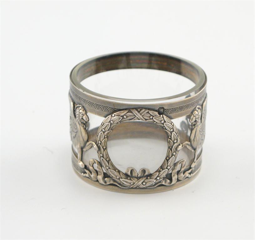 A 19th century French silver salt cellar, post 1838, maker' s mark of A.L in a lozenge, circular form, pierced and embossed with two sphinx holding a laurel wreath, with a clear glass liner, diameter 5cm.